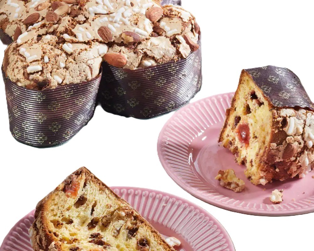 Ingrediente pentru prepararea aluatului (83%): faina de GRAU, UNT, galbenus de OU proaspat, zahar din trestie, coaja de portocala confiata (8%), caise confiate (5%), cirese negre amare (4%) si coaja de lamaie confiata (4%). Aceste fructe confiate sunt preparate cu sirop de glucoza, zahar si arome naturale specifice fiecaruia. Aluatul mai contine maia naturala (din faina de GRAU si apa), emulgatori, faina de MIGDALE (3%), miere, arome naturale, zahar granulat, albus de OU si ulei de masline.