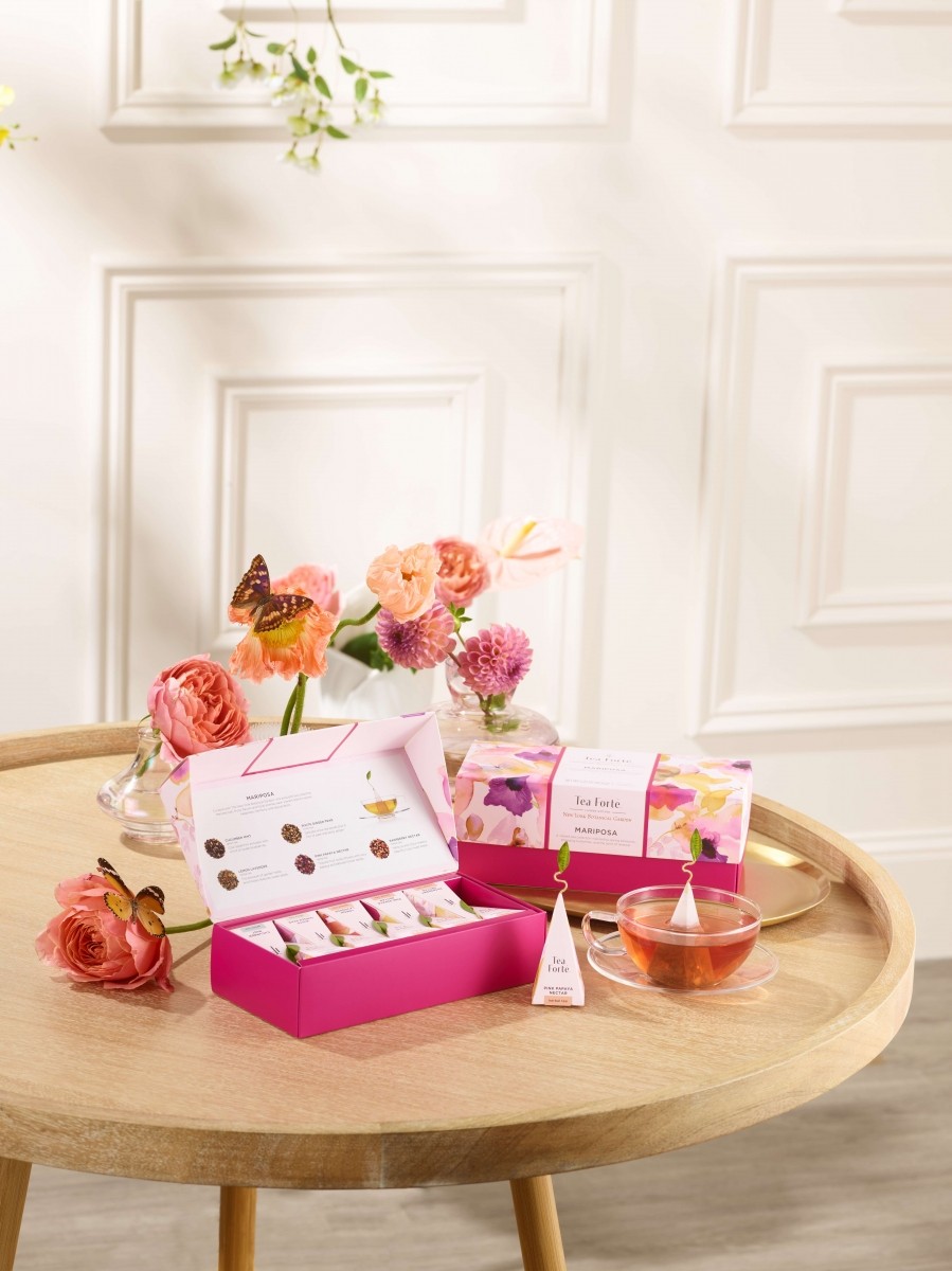 Aceasta cutie eleganta face parte din colectia Mariposa, a sasea colaborare a Tea Forte cu New York Botanical Garden. Inspirata de frumusetea primaverii si a noilor inceputuri, colectia aduce un omagiu naturii prin designul sau delicat. Cutia este decorata cu ilustratii florale realizate de un artist al gradinii botanice, iar culorile pastelate – roz, galben, mov si portocaliu – evoca prospetimea si vitalitatea anotimpului. Ambalajul este elegant si rafinat, potrivit pentru cadouri speciale sau momente de rasfat personal.