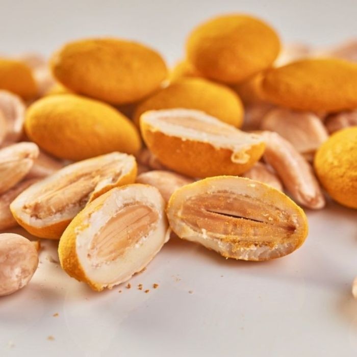 Textura: migdale crocante, acoperite de o glazura cremoasa cu finisaj discret pudrat.