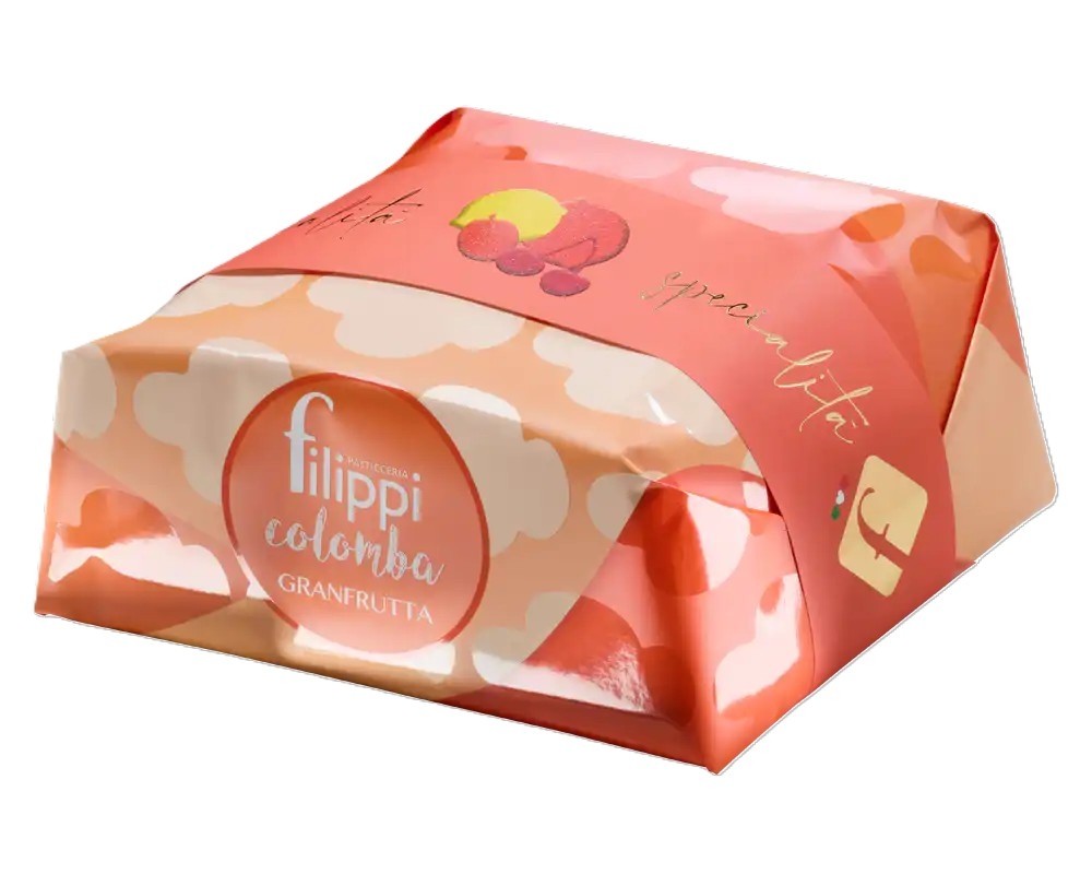 Panettone Filippi Granfrutta cu fructe confiate este creat special pentru iubitorii de fructe. Acest panettone este preparat din felii moi de lamaie si portocale, caise si cirese negre intregi, suculente, fara samburi. Colomba Granfrutta Filippi este un desert deosebit de moale, cu o aroma natural super-fructata! Ambalajul colorat al acestui panettone te face imediat fericit!